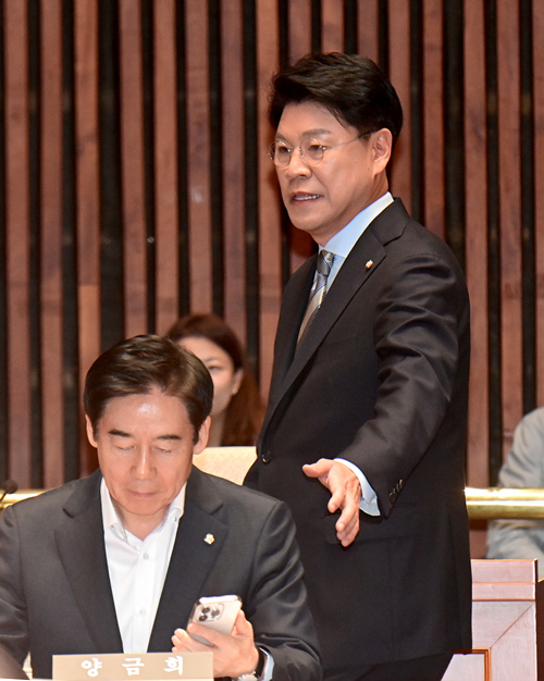 장제원 국민의힘 의원이 6일 오전 국회에서 열린 의원총회에 참석하고 있다.