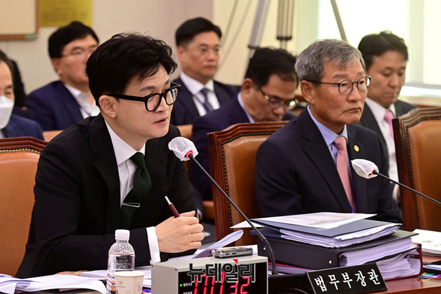 한동훈 법무부 장관이 11일 오전 국회에서 열린 법무부 국정감사에서 의원들의 질의에 답하고 있다.