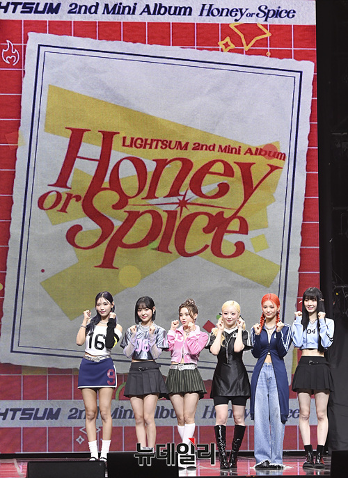 걸그룹 라잇썸(LIGHTSUM)이 11일 오후 서울 용산구 블루스퀘어 마스터카드홀에서 열린 미니 2집 '허니 오어 스파이스(Honey or Spice)' 발매기념 쇼케이스에서 포토타임을 갖고 있다.