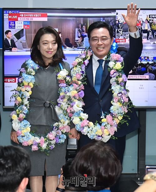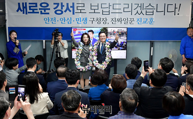 진교훈 더불어민주당 강서구청장 후보 내외가 11일 밤 서울 강서구 마곡동에 마련된 선거사무실에서 당선이 확실시 되자 화이팅을 하고 있다.