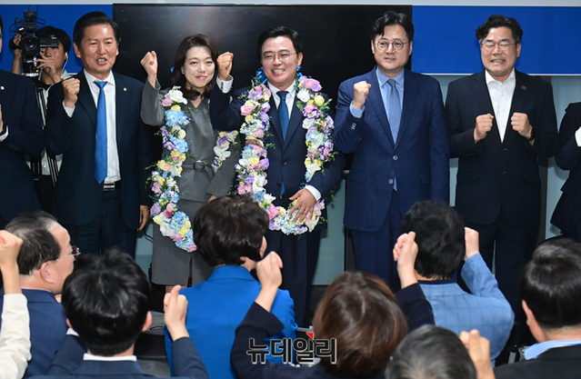 재보궐 선거에서 강서구청장 당선이 확실해진 진교훈 더불어민주당 후보와 지도부가 11일 오후 서울 강서구 선거사무실에서 손을들어 인사하고 있다.
