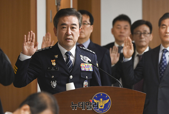 윤희근 경찰청장과 참석자들이 12일 오전 서울 서대문구 경찰청에서 열린 국회 행정안전위원회 국정감사에서 증인선서를 하고 있다.