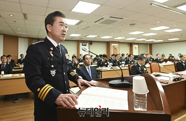 윤희근 경찰청장과 참석자들이 12일 오전 서울 서대문구 경찰청에서 열린 행정안전위원회 국정감사에서 업무보고를 하고 있다.