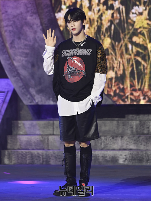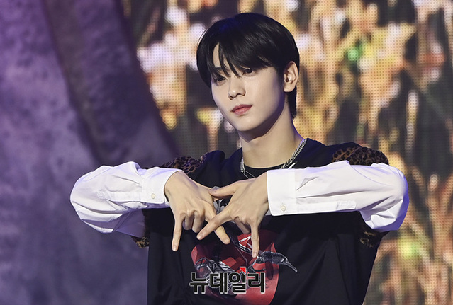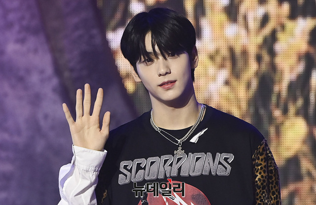 보이그룹 '투모로우바이투게더(TOMORROW X TOGETHER)' 수빈이 12일 오후 서울 동대문구 경희대학교 평화의전당에서 열린 정규 3집 '이름의 장 : 프리폴(FREEFALL)' 발매기념 쇼케이스에서 포토타임을 갖고 있다.