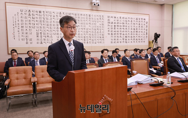 최재해 감사원장이 13일 오전 국회 법제사법위원회에서 열린 2023 국정감사에 출석해 증인선서를 하고 있다.