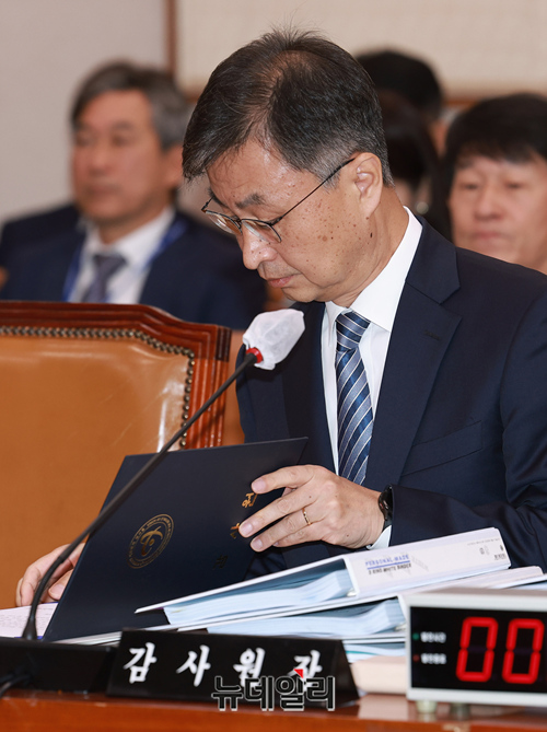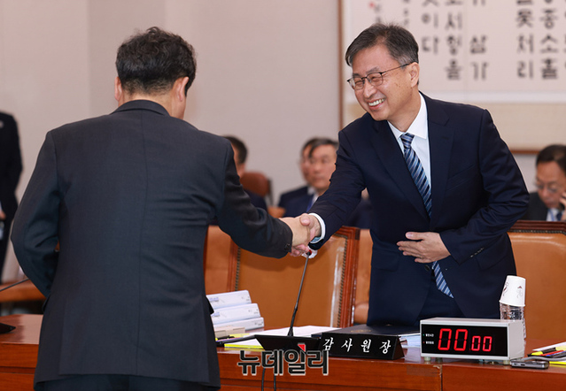 최재해 감사원장이 13일 오전 국회 법제사법위원회에서 열린 2023 국정감사에 출석해 의원들과 인사를 나누고 있다.