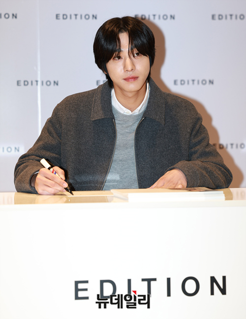 배우 안효섭이 14일 오후 서울 송파구 롯데백화점에서 열린 에디션 센서빌리티 팬사인회에서 팬들에게 전할 사인을 선보이고 있다.