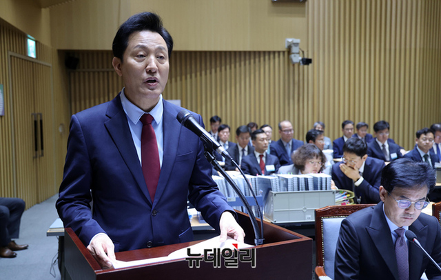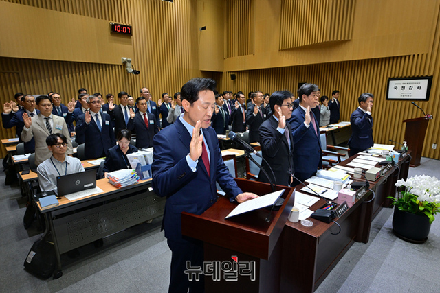 오세훈 서울시장이 16일 오전 서울시청에서 열린 국회 행정안정위원회의 서울시에 대한 국정감사에서 선서를 하고 있다.