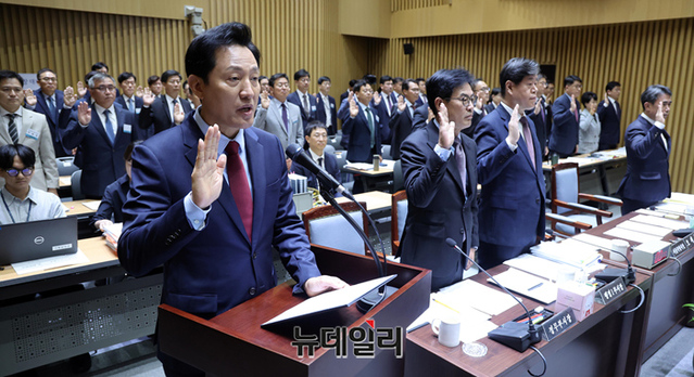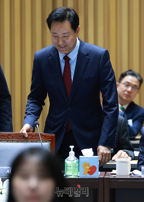 오세훈 서울시장이 16일 오전 서울시청에서 열린 국회 행정안정위원회의 서울시에 대한 국정감사에 출석해 자리하고 있다.