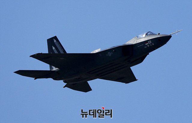 한국형 전투기 보라매(KF-21) 시제 3호기가 16일 오전 서울공항에서 열린 '서울ADEX 2023(서울 국제 항공우주 및 방위산업 전시회) 미디어 데이'에서 축하비행 연습을 하고 있다.