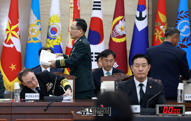 이종호 해군참모총장(왼쪽부터), 박정환 육군참모총장, 이상학 공군참모차장이 16일 오후 서울 용산구 국방부에서 열린 국회 법제사법위원회의 국방부 군사법원에 대한 국정감사에 참석해 자리하고 있다.