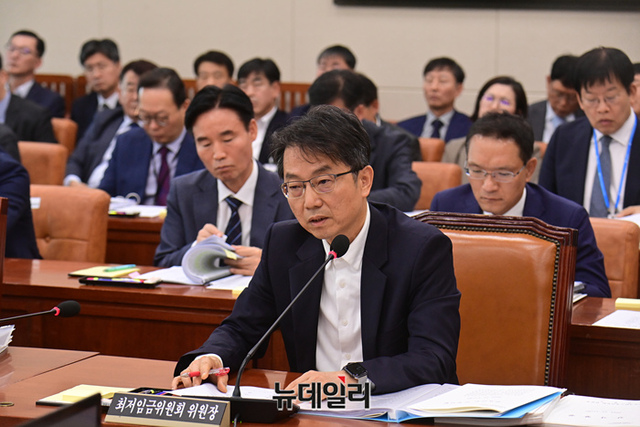 박준식 최저임금위원장이 17일 오전 국회에서 열린 환경노동위원회의 경제사회노동위원회, 최저임금위원회 등에 대한 국정감사에 출석해 의원들의 질문에 답하고 있다.