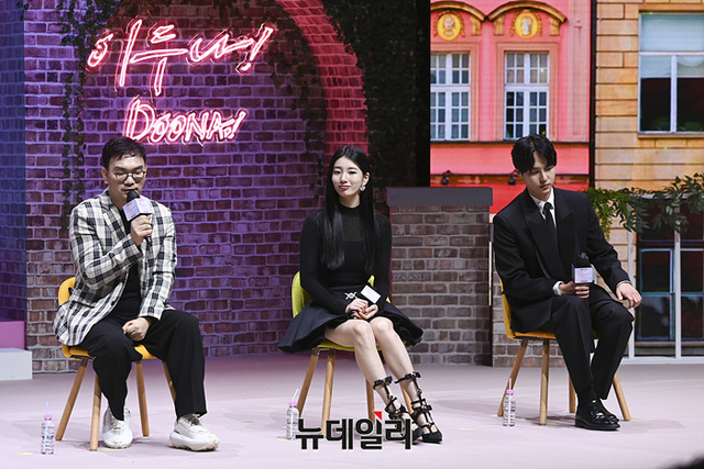 이종효 감독(왼쪽부터), 배우 수지, 양세종이 18일 오전 서울 강남구 코엑스 아티움에서 열린 넷플릭스 시리즈 '이두나!(연출 이정효)' 제작발표회에서 소감을 밝히고 있다.