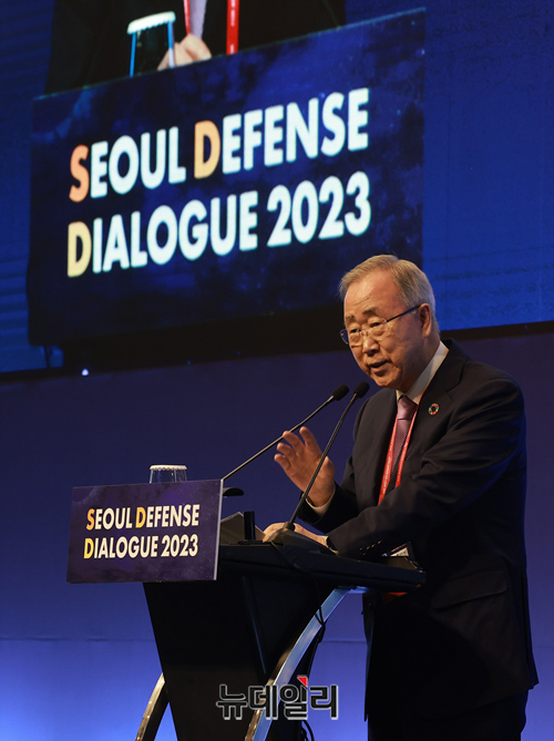반기문 전 유엔사무총장이 18일 오전 서울 강남구 그랜드인터컨티넨탈 파르나스호텔에서 열린 '2023 서울안보대화(SEOUL DEFENSE DIALOGUE)에서 축사를 하고 있다.