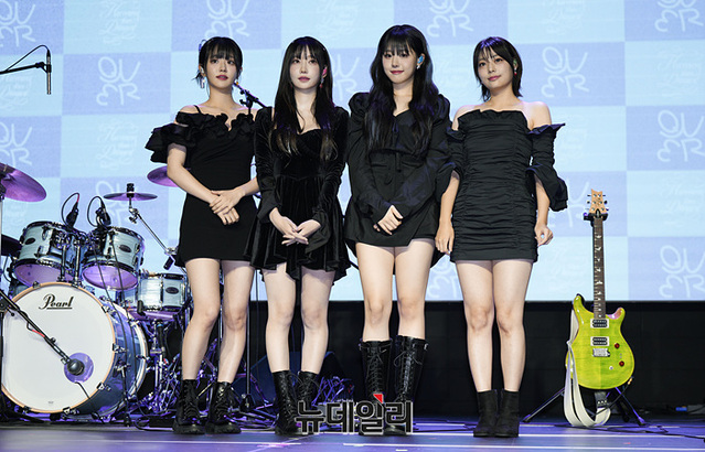 걸밴드 QWER 쵸단(왼쪽부터), 마젠타, 히나, 이시연이 18일 오후 서울 마포구 무신사 개러지에서 열린 데뷔앨범 '하모니 프롬 디스코드(Harmony from Discord)' 쇼케이스에서 포토타임을 갖고 있다.걸밴드 QWER은 글로벌 걸밴드 프로젝트 '최애의 아이들'을 통해 국내 대표 인기 크리에이터 쵸단과 마젠타, 410만 팔로워를 소유한 틱톡커 냥뇽녕냥(히나), 일본 아이돌 그룹 NMB48 출신 이시연으로 구성된 그룹이다.이번 앨범은 타이틀곡 '디스코드(Discord)'를 포함해 다섯 곡을 담았다. 음원은 오후 6시 공개.