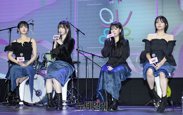 걸밴드 QWER(큐더블유이알) 쵸단(왼쪽부터), 마젠타, 히나, 이시연이 18일 오후 서울 마포구 무신사 개러지에서 열린 데뷔앨범 '하모니 프롬 디스코드(Harmony from Discord)' 쇼케이스에서 소감을 밝히고 있다.걸밴드 QWER은 글로벌 걸밴드 프로젝트 '최애의 아이들'을 통해 국내 대표 인기 크리에이터 쵸단과 마젠타, 410만 팔로워를 소유한 틱톡커 냥뇽녕냥(히나), 일본 아이돌 그룹 NMB48 출신 이시연으로 구성된 그룹이다.이번 앨범은 타이틀곡 '디스코드(Discord)'를 포함해 다섯 곡을 담았다. 음원은 오후 6시 공개.