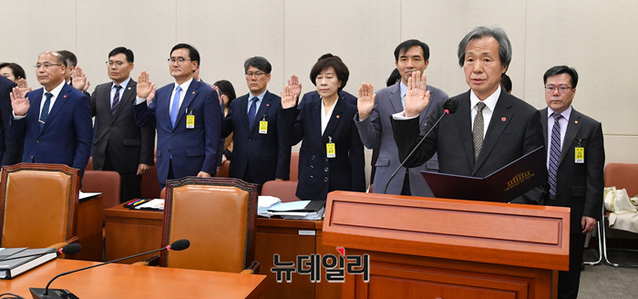 정기석 국민건강보험공단 이사장이 18일 국회에서 열린 보건복지위원회의 국민건강보험공단·건강보험심사평가원에 대한 국정감사에서 선서를 하고 있다.