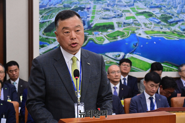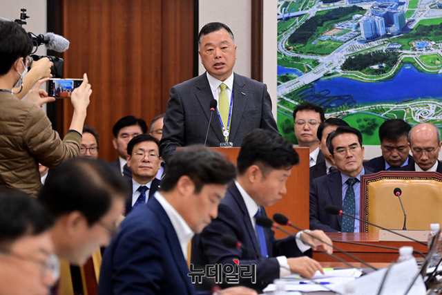 유병태 주택도시보증공사 사장이 19일 국회에서 열린 국토교통위원회의 한국부동산원·주택도시보증공사 등에 대한 국정감사에서 업무보고를 하고 있다.
