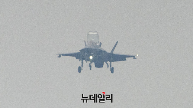 미 해병대 F-35B 수직이착륙(VTOL) 전투기가 19일 오후 서울공항에서 열린 '서울ADEX 2023(서울국제항공우주 및 방위산업전시회)'에서 활주로에 착륙하고 있다.