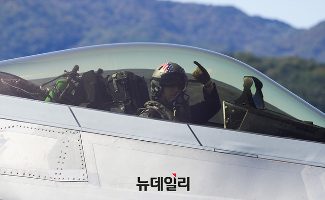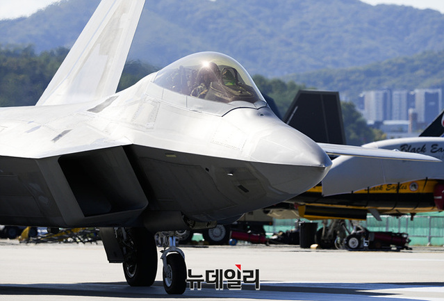 미 공군 F-22 랩터 전투기가 20일 오전 서울공항에서 열린 '서울ADEX 2023(서울 국제 항공우주 및 방위산업 전시회)'에서 시범비행을 준비하고 있다.