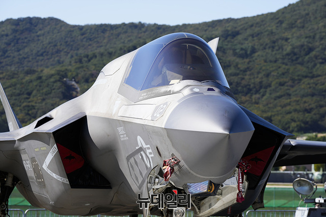 미 해병대 수직이착륙 전투기 F-35B가 20일 오후 서울공항에서 열린 '서울ADEX 2023(서울 국제 항공우주 및 방위산업 전시회)'에 전시돼 있다.