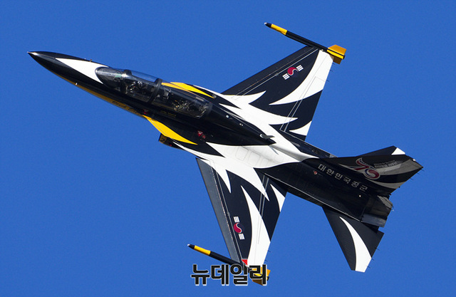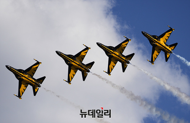 대한민국 공군 특수비행팀 블랙이글스가 20일 오후 서울공항에서 열린 '서울ADEX 2023(서울 국제 항공우주 및 방위산업 전시회)'에서 곡예비행을 선보이고 있다.