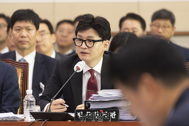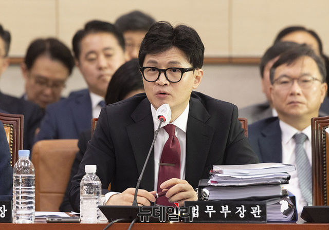 한동훈 법무부 장관이 26일 오전 국회에서 열린 법제사법위원회의 법무부, 법제처, 감사원, 고위공직자범죄수사처, 헌법재판소, 대법원에 대한 종합감사에서 의원들의 질의에 답하고 있다.