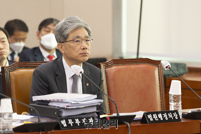김상환 법원행정처장이 26일 오전 국회에서 열린 법제사법위원회의 법무부, 법제처, 감사원, 고위공직자범죄수사처, 헌법재판소, 대법원에 대한 종합감사에서 의원들의 질의를 듣고 있다.