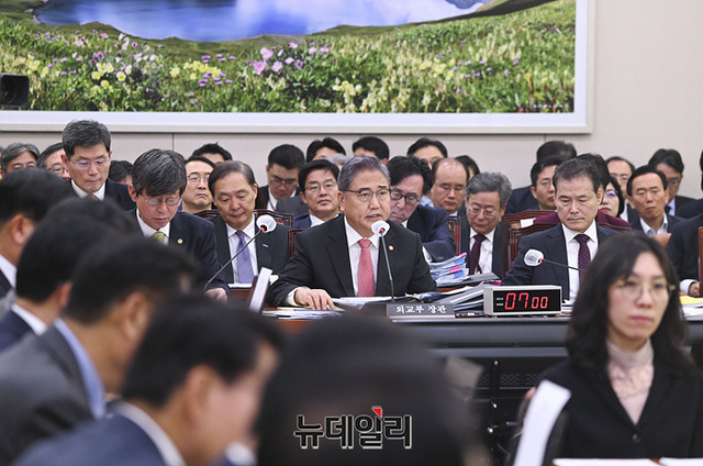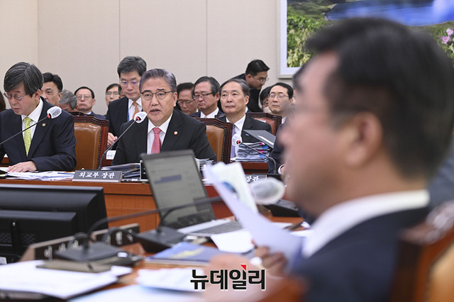 박진 외교부 장관이 27일 오전 국회에서 열린 외교통일위원회의 외교부, 통일부, 재외동포청, 한국국제협력단 등에 대한 종합감사에서 의원의 질의에 답변하고 있다.