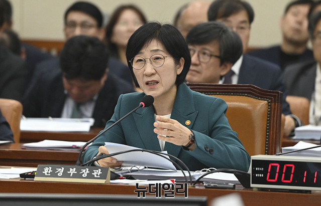 한화진 환경부 장관이 27일 오전 국회에서 열린 환경노동위원회의 환경부와 기상청에 대한 종합감사에서 의원의 질의에 답변하고 있다.