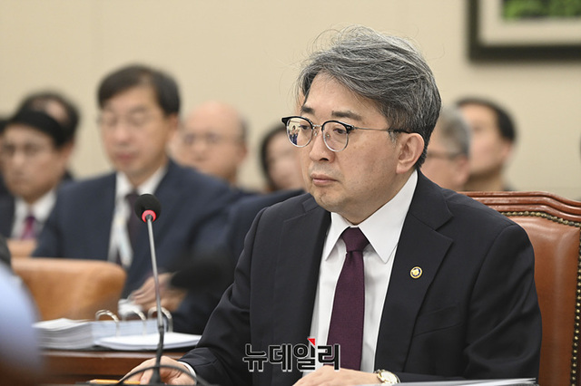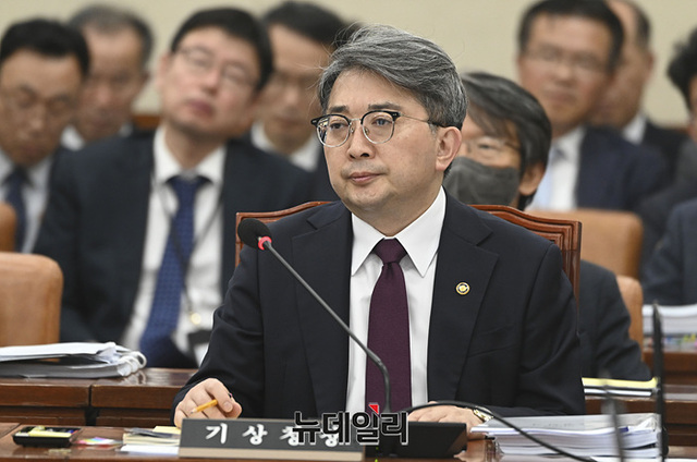 유희동 기상청장이 27일 오전 국회에서 열린 환경노동위원회의 환경부와 기상청에 대한 종합감사에서 의원의 질의를 듣고 있다.
