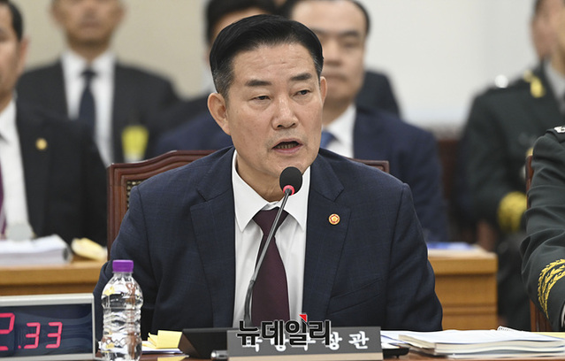 신원식 국방부 장관이 27일 오전 국회에서 열린 국방위원회의 국방부, 병무청, 방위사업청, 합동참모본부 등에 대한 종합감사에서 의원의 질의에 답하고 있다.