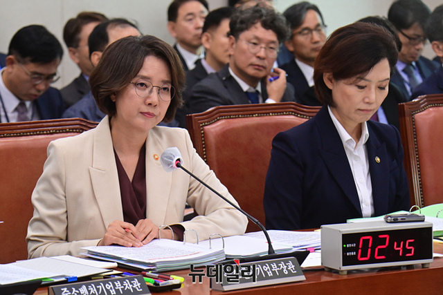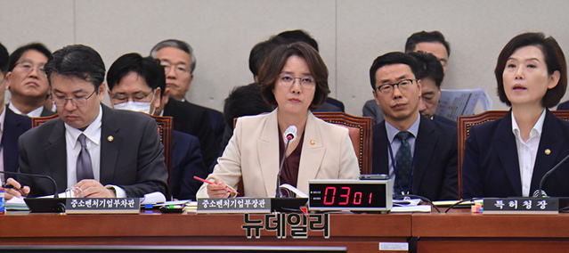 이영 중소벤처기업부 장관이 27일 국회에서 열린 산업통상자원중소벤처기업위원회 등에 대한 종합감사에서 의원들의 질문에 답하고 있다.