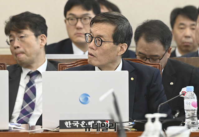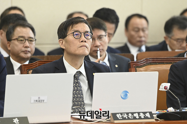 이창용 한국은행 총재가 27일 오전 국회에서 열린 기획재정위원회의 기획재정부, 한국은행, 한국수출입은행, 한국조폐공사, 한국투자공사, 한국재정정보원, 한국원산지정보원에 대한 종합감사에서 의원의 질의를 듣고 있다.