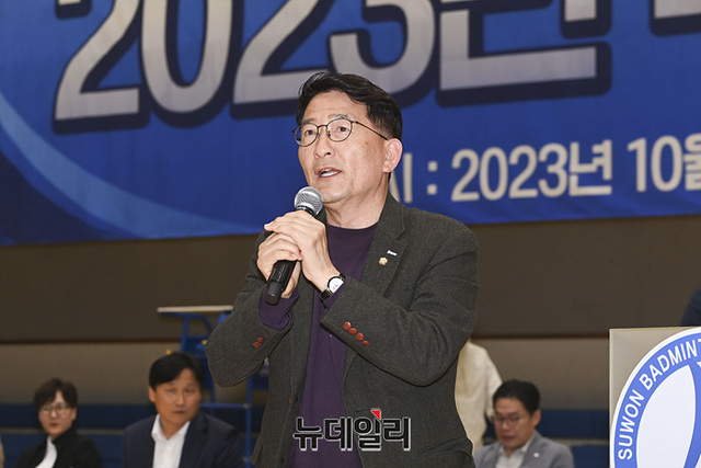 김기정 수원시의회 의장이 28일 오후 경기 수원특례시 만석공원배드민턴경기장에서 열린 '2023 수원배 전국 배드민턴 대회'에서 축사를 하고 있다.