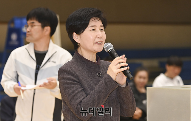 백혜련 더불어민주당 소속 국회의원이 28일 오후 경기 수원특례시 만석공원배드민턴경기장에서 열린 '2023 수원배 전국 배드민턴 대회'에서 축사를 하고 있다.