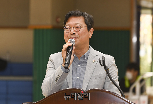 김승원 더불어민주당 소속 국회의원이 28일 오후 경기 수원특례시 만석공원배드민턴경기장에서 열린 '2023 수원배 전국 배드민턴 대회'에서 축사를 하고 있다.