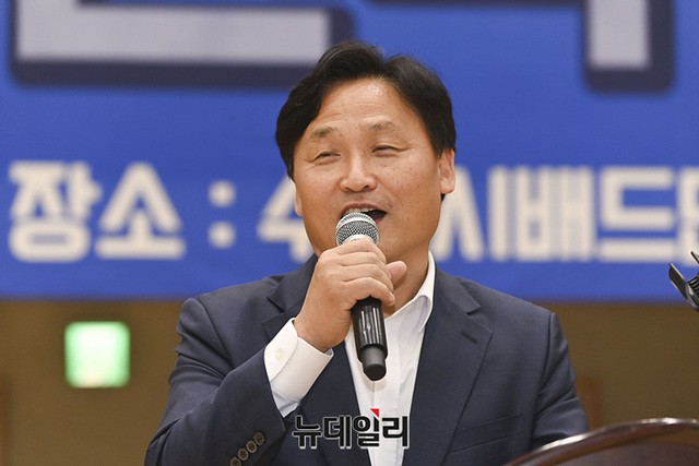 김영진 더불어민주당 소속 국회의원이 28일 오후 경기 수원특례시 만석공원배드민턴경기장에서 열린 '2023 수원배 전국 배드민턴 대회'에서 축사를 하고 있다.