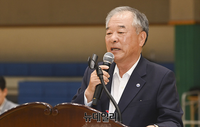 박광국 수원시체육회장이 28일 오후 경기 수원특례시 만석공원배드민턴경기장에서 열린 '2023 수원배 전국 배드민턴 대회'에서 축사를 하고 있다.