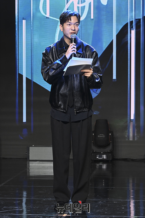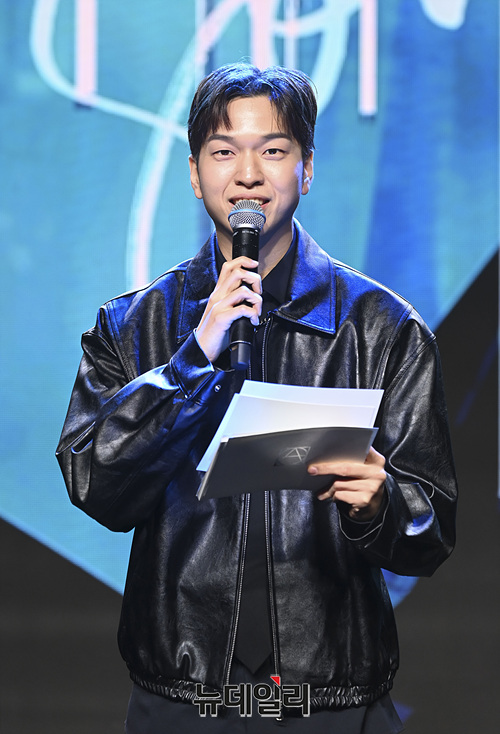 개그맨 유재필이 30일 오후 서울 강남구 일지아트홀에서 열린 두 번째 미니앨범 '썸(SOME)' 발매 기념 오프라인 미디어 쇼케이스에서 문종업을 소개하고 있다.