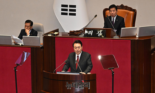윤석열 대통령이 31일 국회 본회의장에서 2024년도 예산안에 대한 시정연설을 하고 있다. (사진=공동취재단)