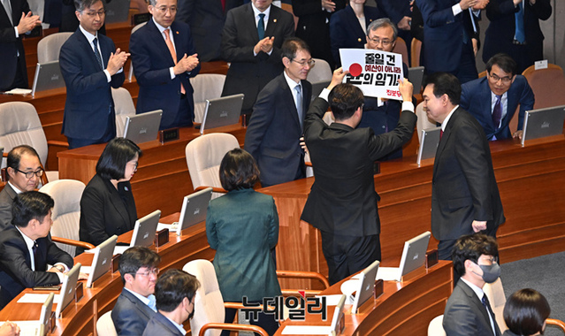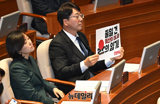 강성희 진보당 의원이 31일 오전 국회 본회의장에서 열린 윤석열 대통령의 2024년도 정부 예산안에 대한 시정연설 중 손팻말을 들고 있다.