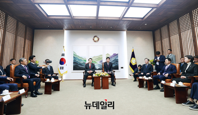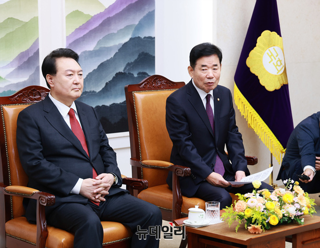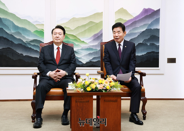 윤석열 대통령이 31일 국회 의장실에서 김진표 의장 등 5부요인, 김기현 국민의힘 대표, 이재명 더불어민주당 대표 등 여야 지도부와 환담하고 있다. (사진=국회제공)