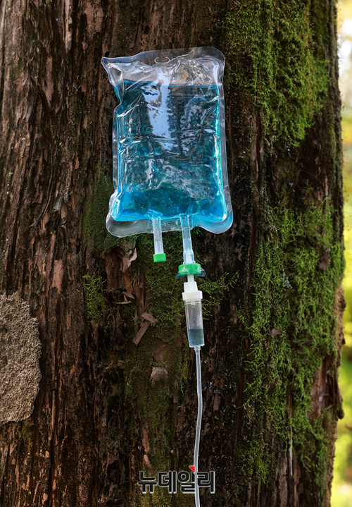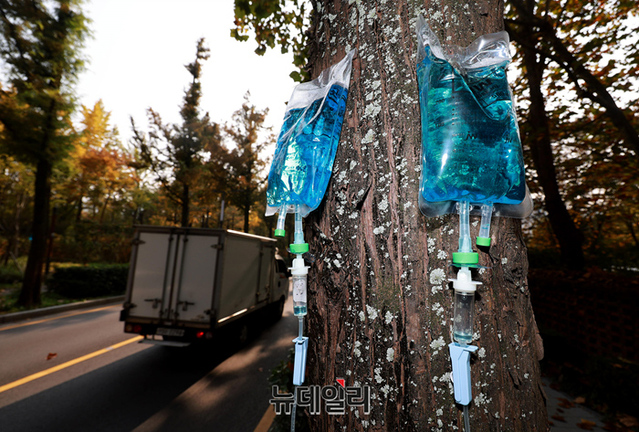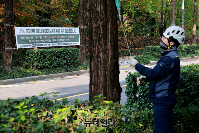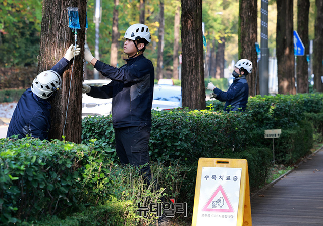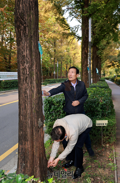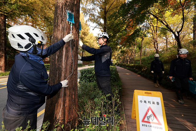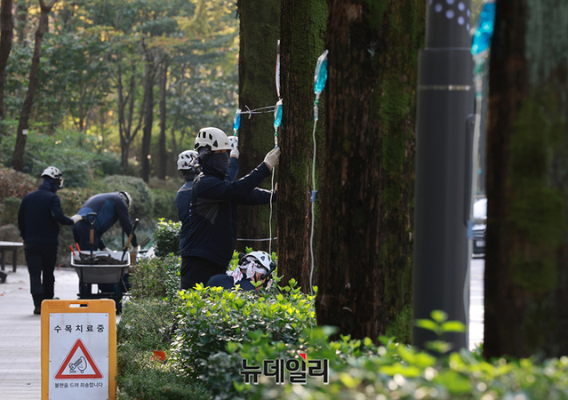 강남구가 31일 오후 서울 강남구 양재천로에 조성된 메타세쿼이아길을 찾아 구멍을 뚫어 영양제를 직접 주입하는 수간주사와 수목치료 작업을 하고 있다.메타세쿼이아 수령은 50~60년으로 최근 나무에 전반적인 황화현상과 일부 수목의 조기 낙엽 증상이 났다. 강남구는 5월부터 수분과 양분의 효과적인 공급을 위해 숨틀(유공관) 434개를 설치해 관수 및 영양공급을 실시하고 있다.현장을 찾은 조성명 강남구청장은 “양재천의 수려한 정취를 만드는 메타세쿼이아 나무를 사랑하고 걱정하는 구민들을 위해 나무를 살리기 위해 백방으로 노력하고 있다”며 “꾸준히 생육상태를 관리해 양재천 메타세쿼이아 길이 잘 보전될 수 있도록 최선을 다하겠다”로 말했다.