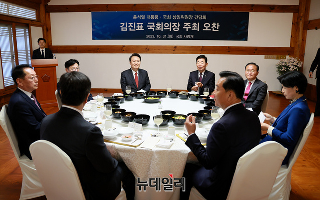 윤석열 대통령이 31일 2024년도 예산안 및 기금운용 계획안에 대한 시정연설을 마친 후 국회 사랑재에서 열린 김진표 국회의장 주최 국회 상임위원장, 여야 정당 원내대표와의 오찬 간담회를 갖고 있다. (사진=국회제공)