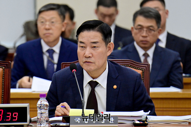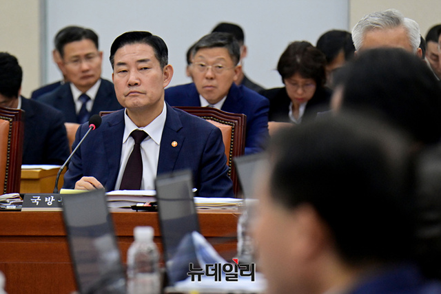 신원식 국방부 장관이 1일 오후 국회에서 열린 국방위원회 전체회의에서 예산안 의원들의 질문에 답하고 있다.