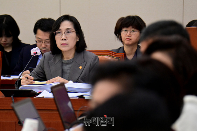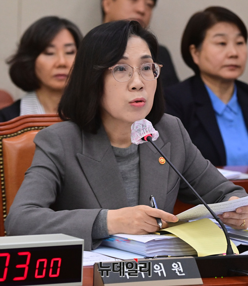 김현숙 여성가족부 장관이 2일 오전 국회에서 열린 여성가족위원회 국정감사에 출석해 의원들의 질문에 답하고 있다.