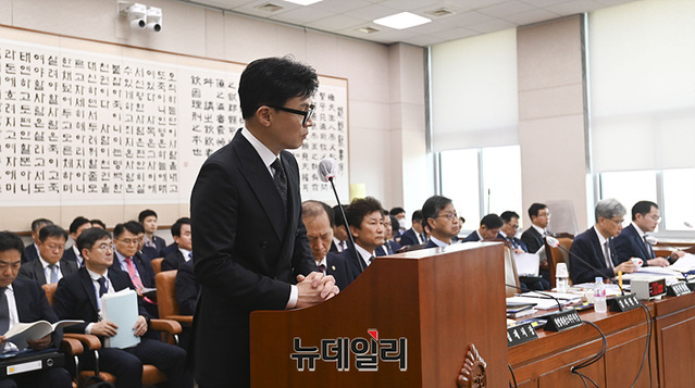 한동훈 법무부 장관이 2일 오후 국회에서 열린 법제사법위원회 전체회의에서 '2024년도 예산안 및 기금운영계획안' 관련 보고를 하고 있다.