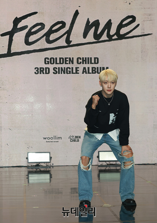 골든차일드 이장준이 2일 오후 서울 강남구 일지아트홀에서 열린 세번째 싱글앨범 'Feel me' 쇼케이스에서 포토타임을 갖고 있다.
