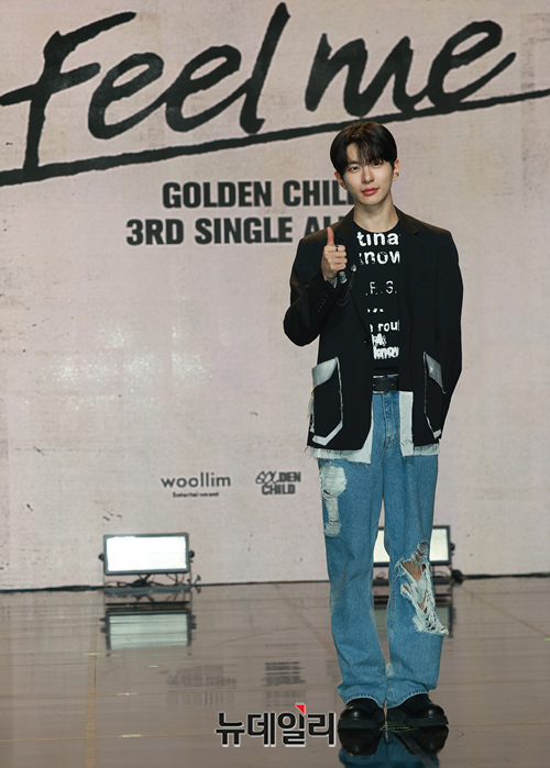 골든차일드 최보민이 2일 오후 서울 강남구 일지아트홀에서 열린 세번째 싱글앨범 'Feel me' 쇼케이스에서 포토타임을 갖고 있다.